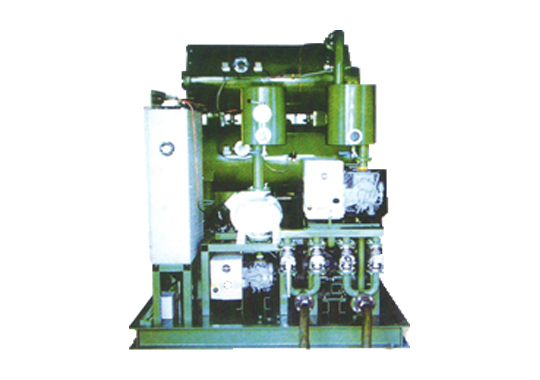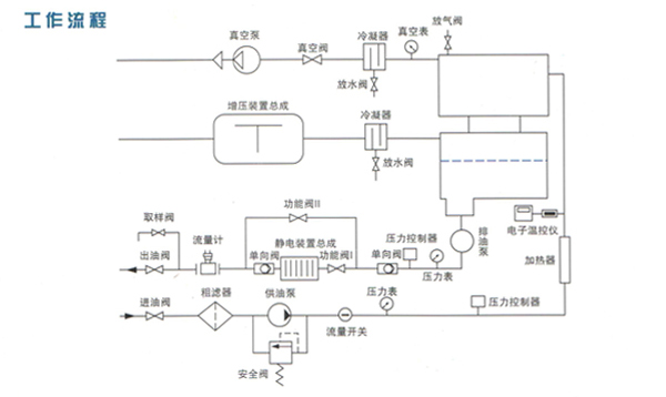 油液在供油泵的作用下由進(jìn)油口進(jìn)入粗濾器,通過粗濾器除去油中較大雜質(zhì)后經(jīng)過加熱器時(shí)被加熱到55℃左右,加熱后的油液首先通過初級(jí)真空罐內(nèi)的脫氣元件噴射到真空罐內(nèi),在真空狀態(tài)下,水份會(huì)低溫沸騰而變成水蒸氣,然后被真空泵抽出,被抽出的水蒸氣在通過冷凝器時(shí)大部分被冷凝成水,小部分透過真空排氣口排出。
